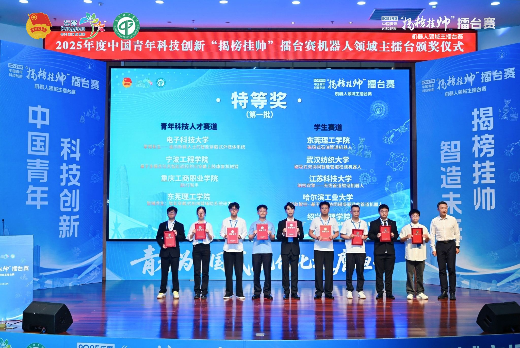 以国家需求为“榜”,以青春智慧“挂帅”。2025年10月10日至12日,第十九届“挑战杯”全国大学生课外学术科技作品竞赛2025年度中国青年科技创新“揭榜挂帅”擂台赛“机器人领域”终审擂台赛在广东省东莞市圆满落幕。我校本科生院工创中心吴世林教授团队组织指导的《磁吸式双协同智能管道检测机器人》项目成功入围此次“揭榜挂帅”擂台赛的终审决赛并斩获全国特等奖,实现了“挑战杯”竞赛国赛专项赛新突破。